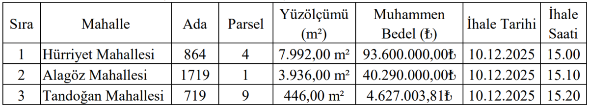 Hürriyet, Alagöz ve Tandoğan Mahalleri’nde yer alan parseller, farklı kullanım alanları ve imar durumları ile yatırımcılar için cazip fırsatlar sunuyor. Konut, ticaret veya enerji istasyonu projeleri için ideal olabilecek taşınmazlar, 10 Aralık’ta kapalı teklif usulüyle alıcılarını bekliyor.