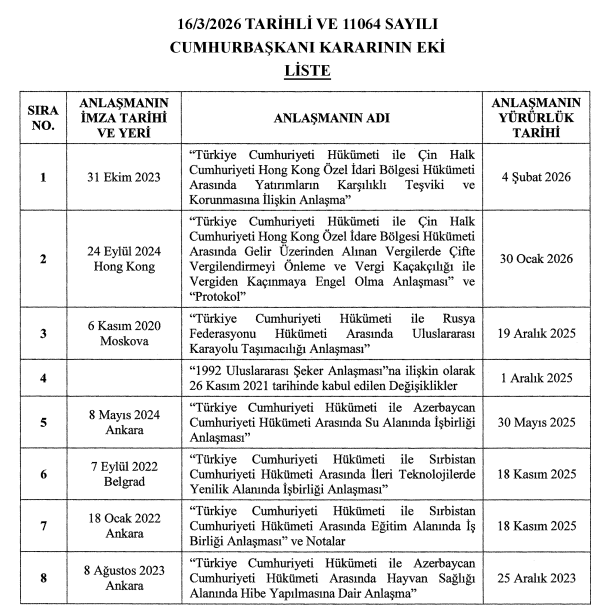Resmî Gazete’de yayımlanan Cumhurbaşkanı Kararı ile yürürlüğe giren anlaşmalar; yatırım, vergi, ulaştırma, teknoloji, eğitim, tarım ve uluslararası ticaret gibi birçok farklı alanı kapsıyor.