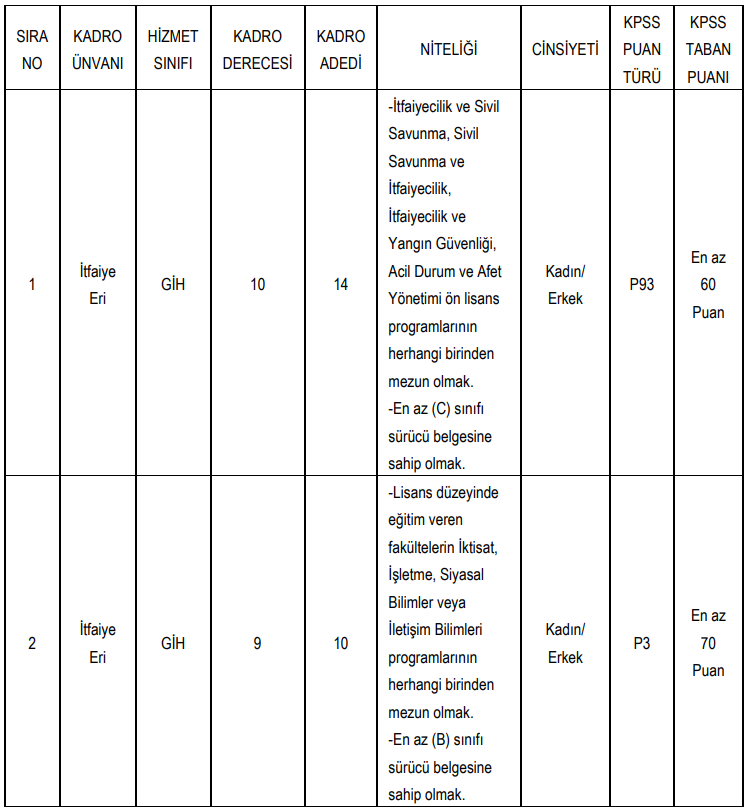 Ön Lisans Mezunları: İtfaiyecilik ve Sivil Savunma, Sivil Savunma ve İtfaiyecilik, İtfaiyecilik ve Yangın Güvenliği, Acil Durum ve Afet Yönetimi ön lisans programlarından mezun olanlar başvurabilecek. Bu kadro için en az C sınıfı sürücü belgesi şartı bulunuyor ve KPSS P93 puan türünden en az 60 puan alınması gerekiyor.