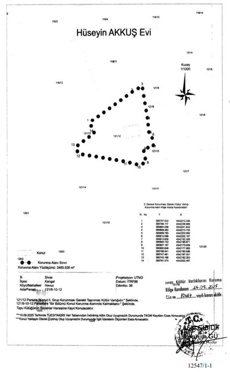 Sivas Kültür Varlıklarını Koruma Bölge Kurulu, 26 Eylül 2025 tarihli 509 sayılı toplantısında Kangal İlçesi, Havuz Köyü’nde yer alan Hüseyin Akkuş Evi hakkında önemli bir koruma kararı aldı. Kurul, sit alanı dışında bulunan ve özel mülkiyete ait 121 ada 12 parselde yer alan evin korunma alanını belirleyerek yapı grubunu II. grup olarak tescilledi. Karar doğrultusunda tescil fişi güncellendi ve ilgili tapu kayıtlarına gerekli şerhler konulması kararlaştırıldı.
