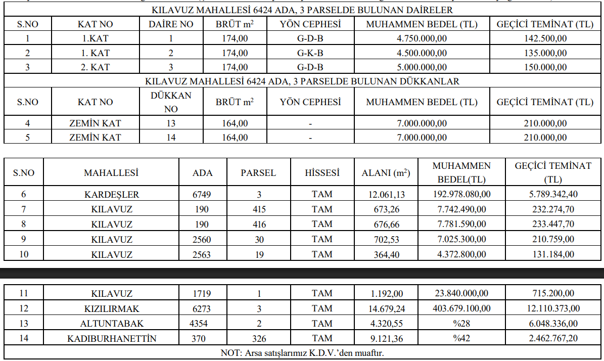 Satış listesinde ilk sırada Kılavuz Mahallesi 6424 ada 3 parselde bulunan daireler yer alıyor. Brüt 174 metrekare büyüklüğe sahip üç ayrı daire için muhammen bedeller 4 milyon 500 bin TL ile 5 milyon TL arasında değişiyor.