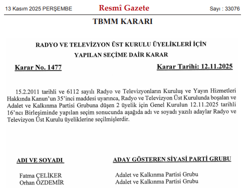 13 Kasım 2025 tarihli ve 33076 sayılı Resmî Gazete’de yayımlanan TBMM Kararı’na göre, RTÜK üyelikleri için yapılan seçim “Karar No: 1477” ile resmiyet kazandı. TBMM Başkanlığı tarafından yayımlanan kararda, seçimlerin 12 Kasım 2025 tarihinde yapılan 16’ncı Birleşim’de gerçekleştirildiği belirtildi.