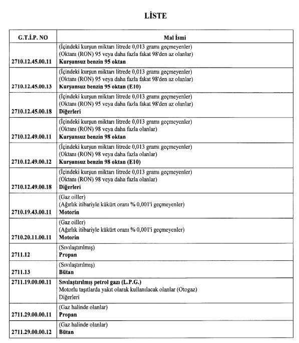 Listede her bir ürün için G.T.İ.P. numaraları da ayrı ayrı belirtildi. Bu kapsamda benzin türleri, motorin çeşitleri ve LPG ürünleri yeni ÖTV mekanizmasına dahil edildi.