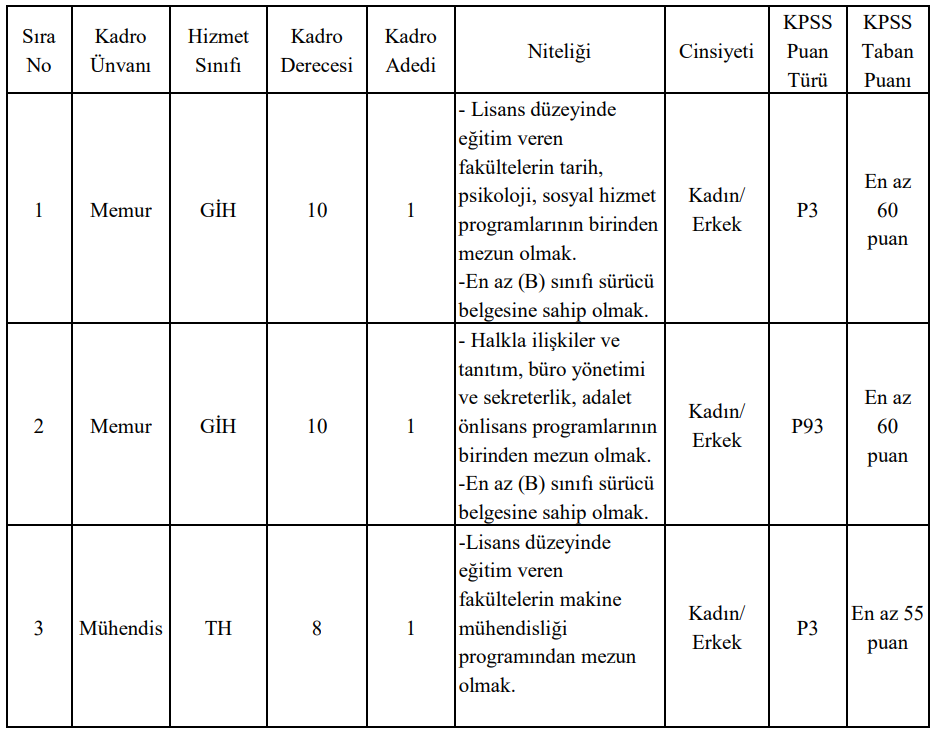 Her kadro için uygun bölüm mezunu olmanın yanı sıra adayların: