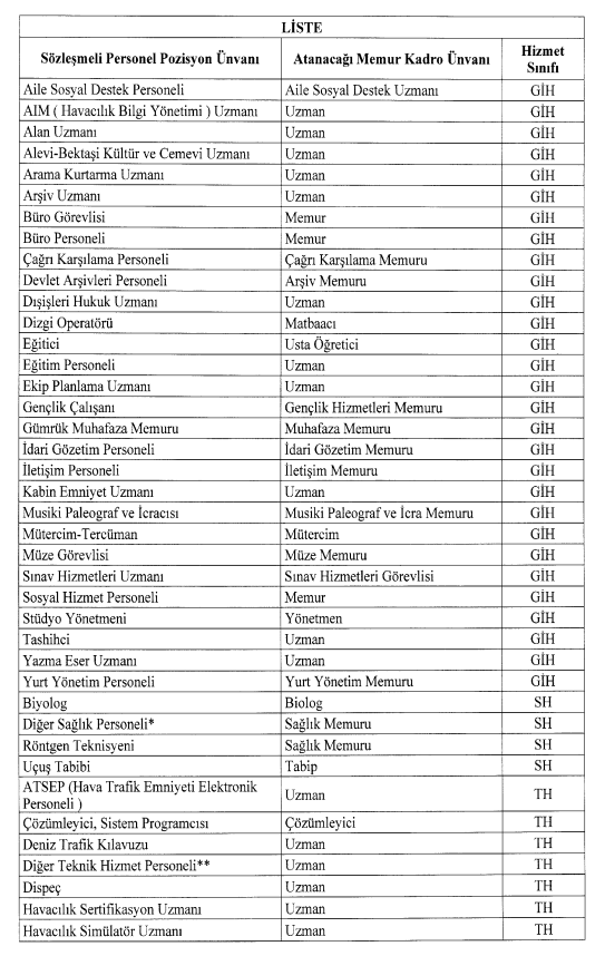 Ekli listede yer alan bilgilere göre; büro görevlileri ve büro personelleri “memur”, çağrı karşılama personeli “çağrı karşılama memuru”, devlet arşivleri personeli ise “arşiv memuru” kadrolarına atanabilecek. Bunun yanında gençlik çalışanlarının “gençlik hizmetleri memuru”, iletişim personelinin ise “iletişim memuru” kadrolarına geçişi öngörülüyor.