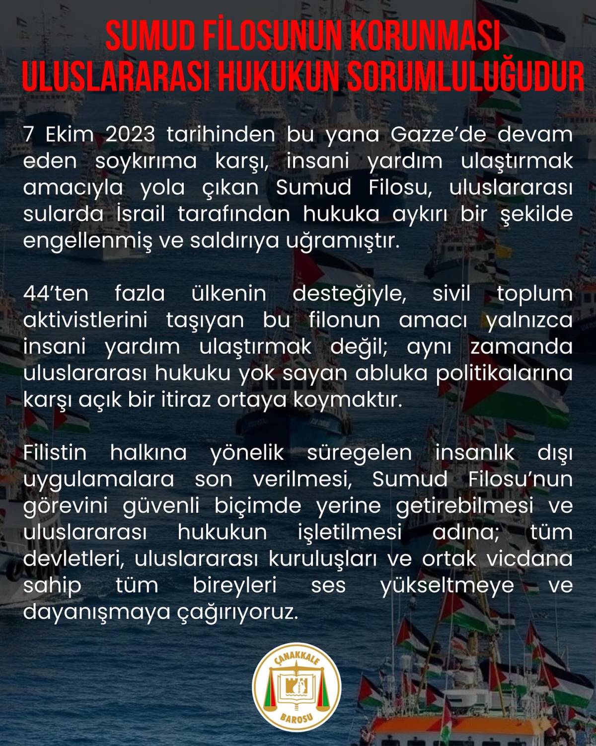 Çanakkale Barosu, Sumud Filosu’na yapılan bu saldırıyı kınayarak, uluslararası hukukun işletilmesinin ve sivillere yönelik hak ihlallerinin önlenmesinin tüm devletlerin ve uluslararası kuruluşların sorumluluğunda olduğunu vurguladı.