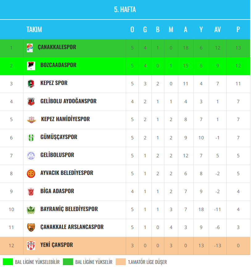 5. hafta müsabakalarının ardından Çanakkale Süper Amatör Lig’de puan durumu yeniden şekillendi. Üst sıralarda yer alan takımlar arasındaki puan farkı azalırken ligin ilerleyen haftalarında rekabetin daha da yoğunlaşması bekleniyor.