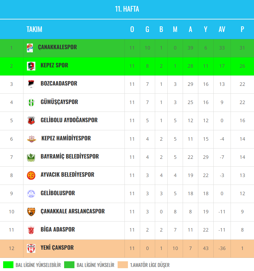 Çanakkale Süper Amatör Lig’de 11. hafta oynanan karşılaşmalar ve alınan sonuçlar şöyle: