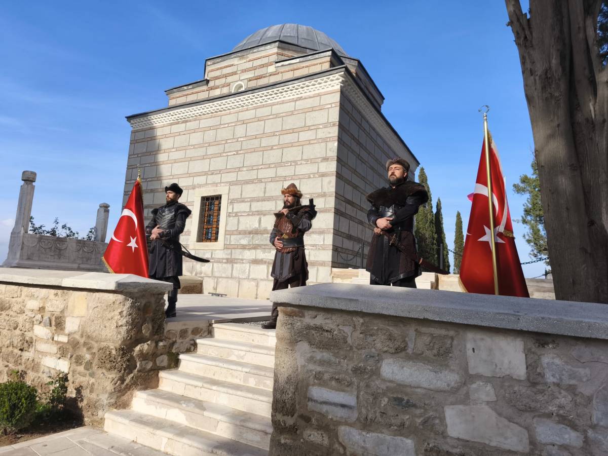 Bursa İl Jandarma Komutanlığına bağlı personel, alp kıyafetleri ve geleneksel teçhizatlarıyla türbe önünde saygı nöbeti tuttu. Nöbet seremonisi törene katılanlar tarafından ilgiyle izlendi.