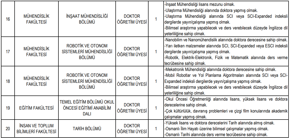 Üniversite tarafından yayımlanan ilanda doktor öğretim üyesi kadrolarına da geniş kapsamlı alım yapılacağı belirtildi.