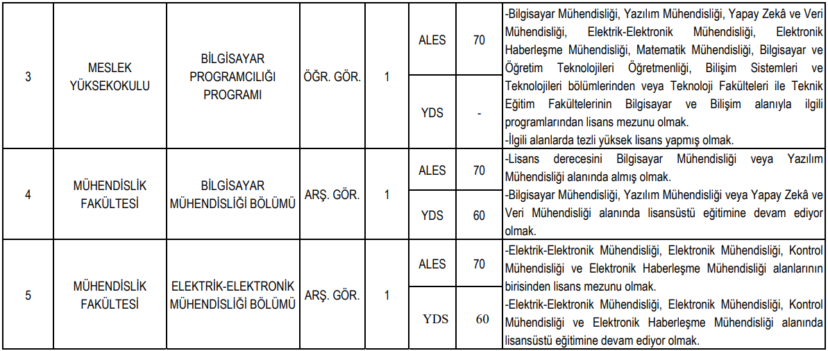 Bilgisayar mühendisliği, yazılım mühendisliği, yapay zekâ ve veri mühendisliği, elektrik-elektronik mühendisliği, inşaat mühendisliği, robotik ve otonom sistemler mühendisliği gibi birçok alanda doktor öğretim üyesi kadroları açıldı.