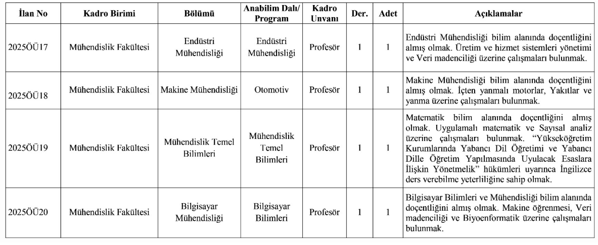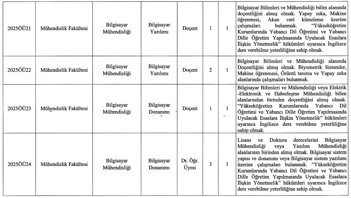 2547 sayılı Kanun’un Ek 38. maddesi kapsamında belirlenen %30’luk kota dahilinde başvuru yapılabilecek doktor öğretim üyesi kadrosunun bu ilanda yer almadığı da ayrıca duyuruldu.