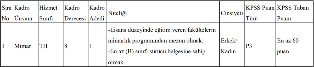 Adayların lisans düzeyinde mimarlık bölümünden mezun olması şartı aranıyor. Ayrıca başvuru yapacak adayların en az B sınıfı sürücü belgesine sahip olması gerekiyor. Kadro için erkek ve kadın adaylar başvuruda bulunabilecek.