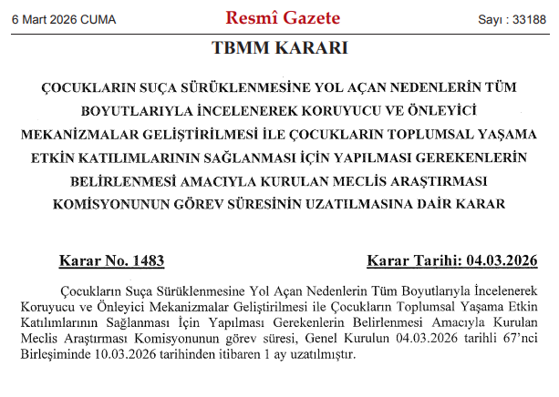 Türkiye Büyük Millet Meclisi’nde çocukların suça sürüklenmesine yol açan nedenlerin araştırılması amacıyla kurulan Meclis Araştırması Komisyonu ile ilgili önemli bir karar alındı. 6 Mart 2026 tarihli Resmî Gazete’de yayımlanan TBMM kararıyla komisyonun görev süresi uzatıldı.