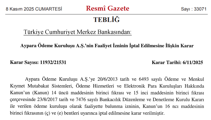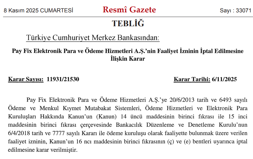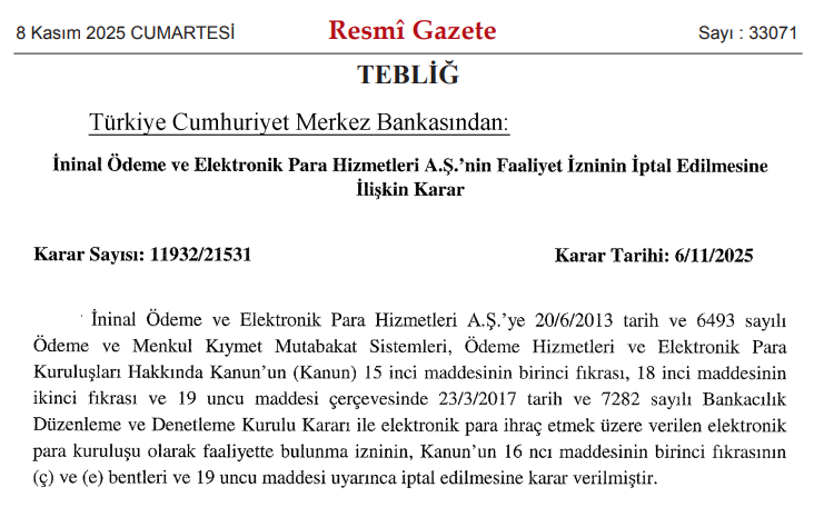 Türkiye Cumhuriyet Merkez Bankası (TCMB), 8 Kasım 2025 tarihli Resmî Gazete'de yayımladığı tebliğler ile üç önemli ödeme ve elektronik para kuruluşunun faaliyet izinlerinin iptal edildiğini duyurdu. Karar; İninal Ödeme ve Elektronik Para Hizmetleri A.Ş., Aypara Ödeme Kuruluşu A.Ş. ve Pay Fix Elektronik Para ve Ödeme Hizmetleri A.Ş.'yi kapsıyor.