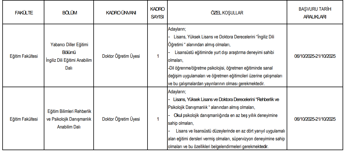 Her iki ilan için son başvuru tarihi 21 Ekim 2025 olarak belirlendi.