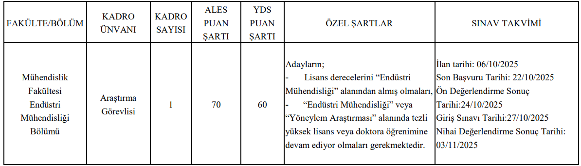 Mühendislik Fakültesi Endüstri Mühendisliği Bölümüne alınacak araştırma görevlisi için şu şartlar aranıyor: