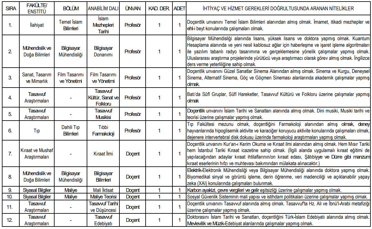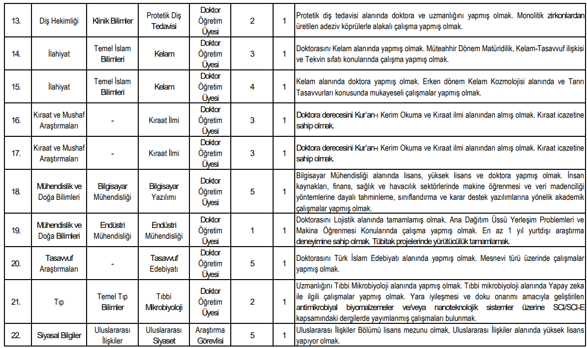 Adaylar ilan edilen kadrolardan yalnızca birine başvurabilecek. Yurt dışından alınan diplomalar için YÖK veya ÜAK tarafından onaylanmış denklik belgesi zorunlu olacak.