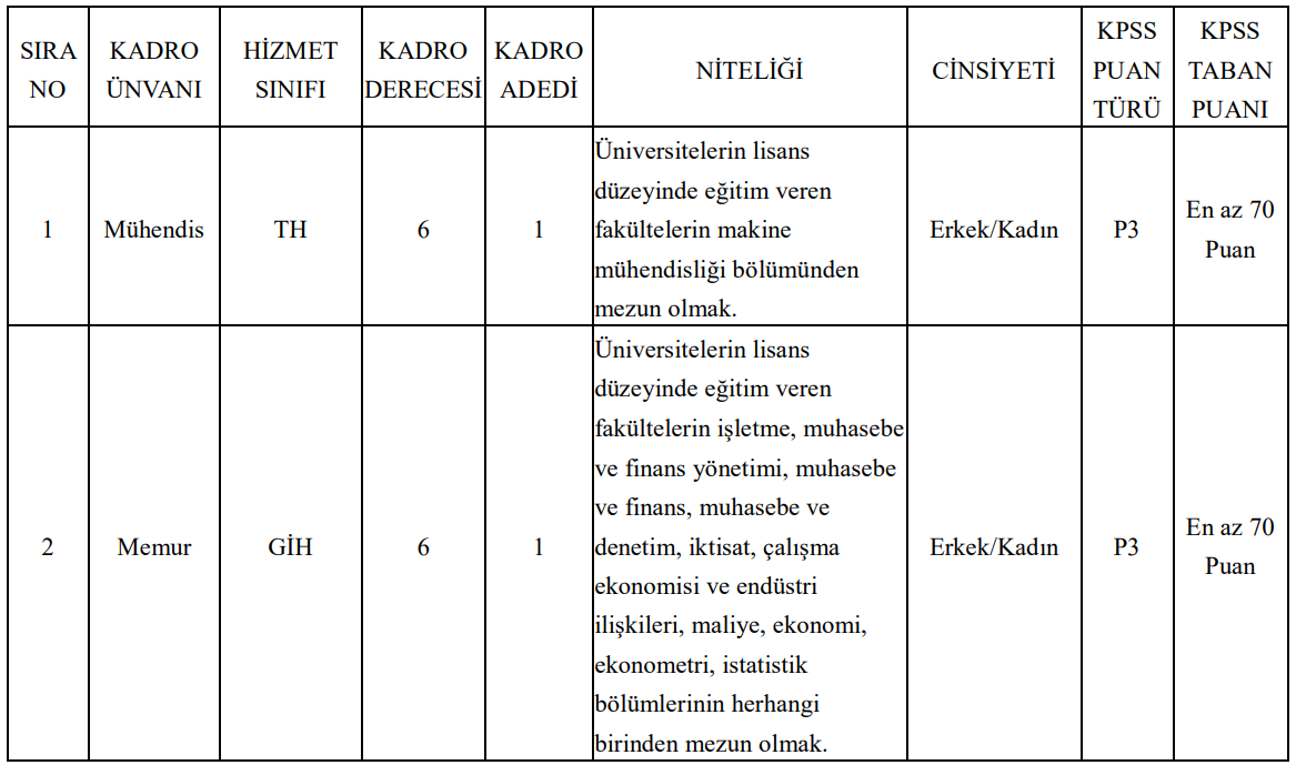 Toplam 2 kadro için yapılacak alımda 1 mühendis ve 1 memur istihdam edilecek. Başvuru şartları, istenen belgeler, sınav tarihi ve değerlendirme kriterleri de ilanla birlikte açıklandı.