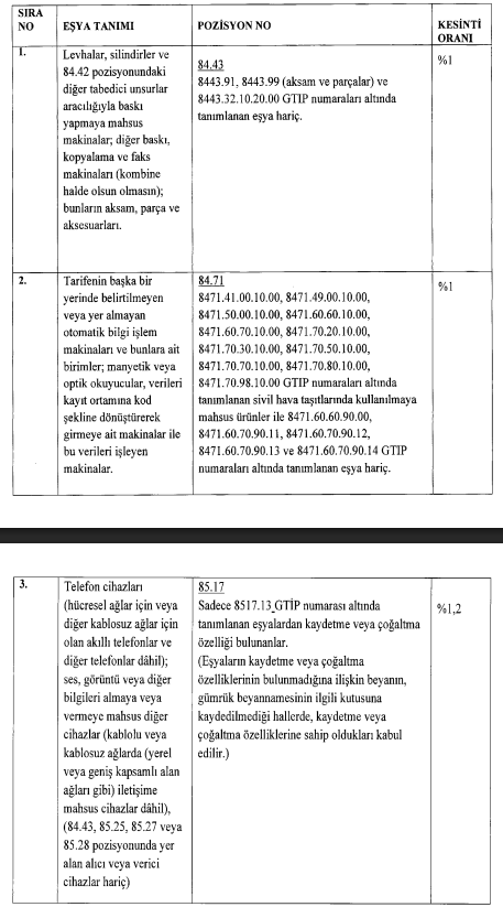 Kararın ikinci maddesiyle birlikte, söz konusu Cumhurbaşkanı Kararına ekli listede yer alan 1, 2 ve 3 numaralı satırlar yeniden düzenlendi. Bu listede, fikir ve sanat eserlerinin çoğaltılmasına imkân sağlayan teknik cihazlar ile boş taşıyıcı materyaller için uygulanacak kesinti oranları yer alıyor.