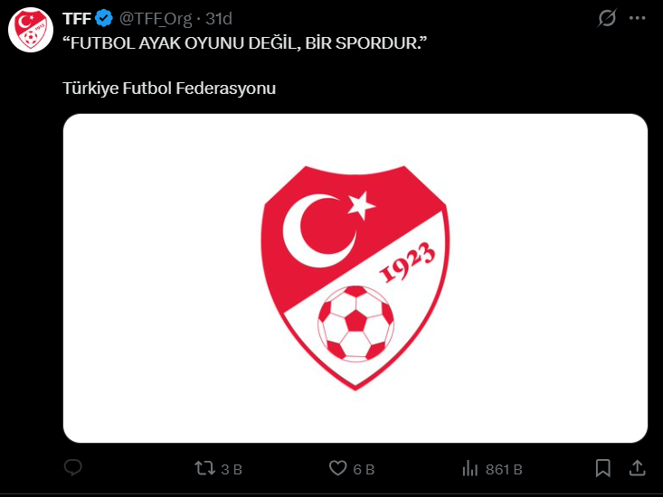 TFF’nin yaptığı tek cümlelik paylaşımda, “Futbol ayak oyunu değil, bir spordur.” ifadesine yer verildi. Kısa ancak dikkat çekici bu mesajın, Galatasaray’ın açıklamasına yanıt niteliğinde olduğu değerlendirildi.