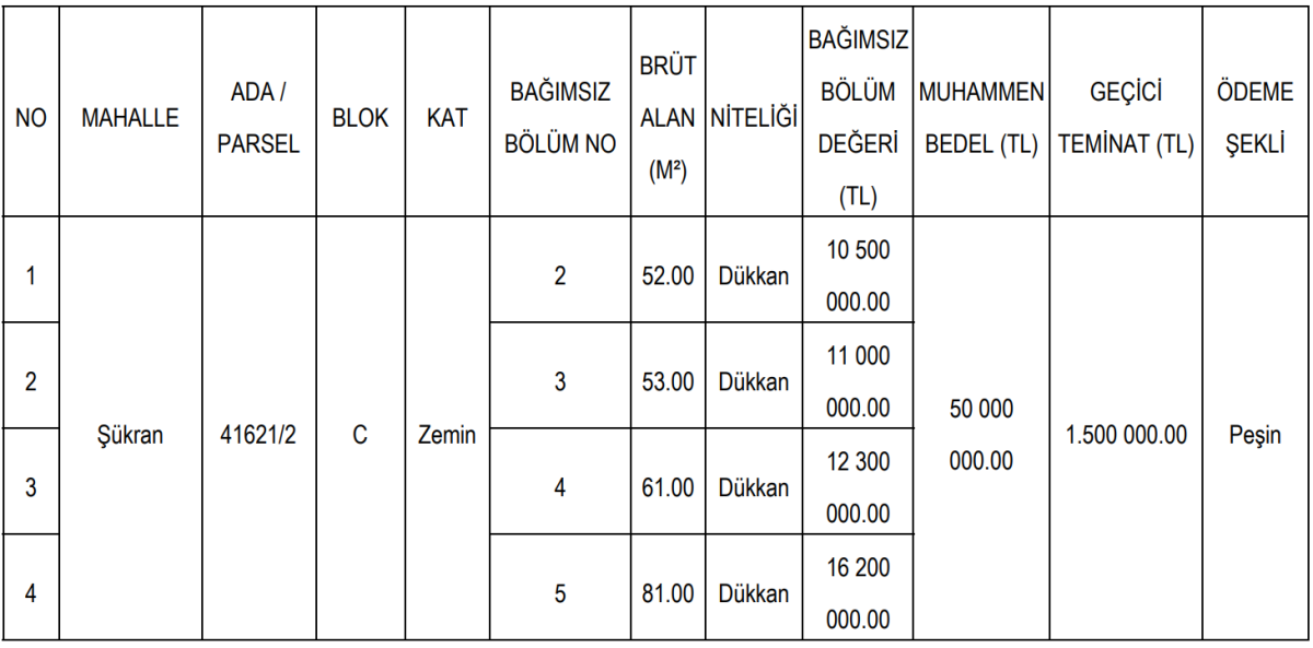 Satışa konu taşınmazlar, Şükran Mahallesi 41621 ada 2 parsel üzerinde yer alan C Blok zemin kattaki 2, 3, 4 ve 5 numaralı bağımsız bölümlerden oluşuyor. Toplam brüt alanı 247 metrekare olan dört dükkan, tek dosya üzerinden ve birbirinden ayrılmadan birlikte satılacak.