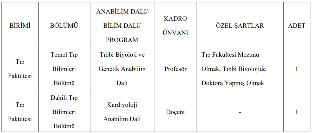 İlana göre öğretim üyesi alımı, Tıp Fakültesi bünyesinde gerçekleştirilecek. Alım yapılacak bölümler, anabilim dalları ve kadro unvanları net şekilde duyuruldu. Bu kapsamda hem profesör hem de doçent unvanlarında akademik personel istihdam edilecek.