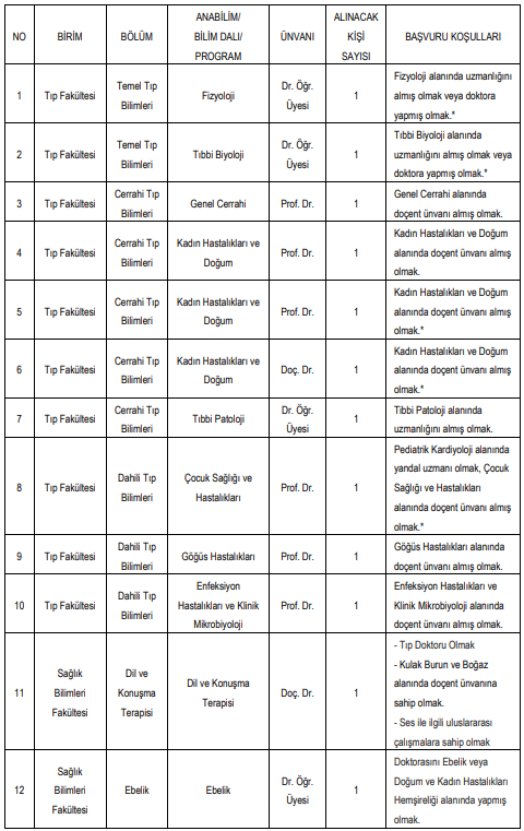 Üniversitenin akademik yapılanmasını güçlendirmeyi hedefleyen ilana birçok bölüm ve anabilim dalı için kadro açıldı. Başvurular belirlenen şartlar kapsamında ilgili birimlere şahsen veya posta yoluyla yapılacak.