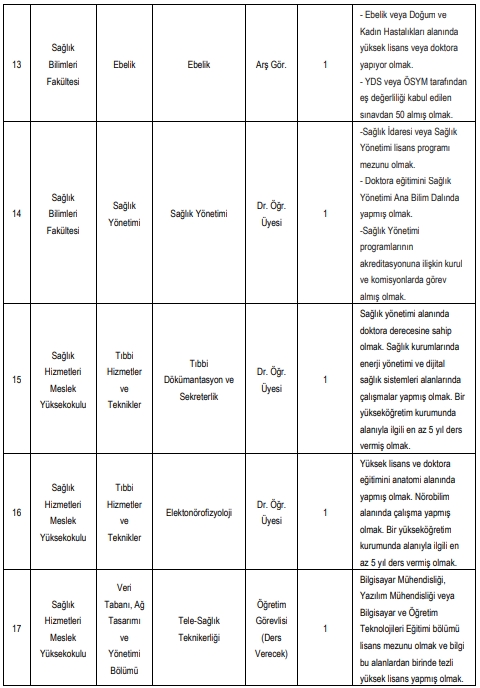 İlanda Tıp Fakültesi, Sağlık Bilimleri Fakültesi ve Sağlık Hizmetleri Meslek Yüksekokulu başta olmak üzere çeşitli birimlerde 17 farklı kadro yer alıyor. Öne çıkan pozisyonlardan bazıları şöyle: