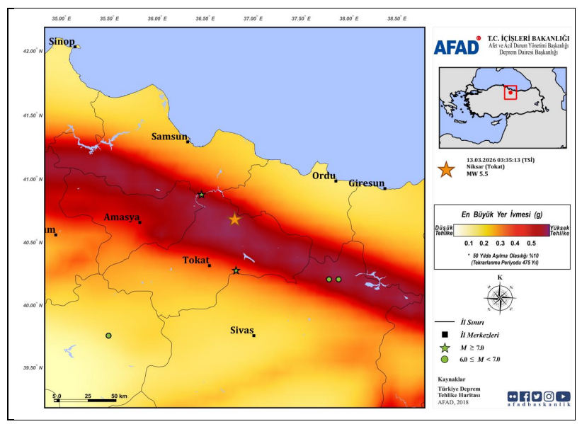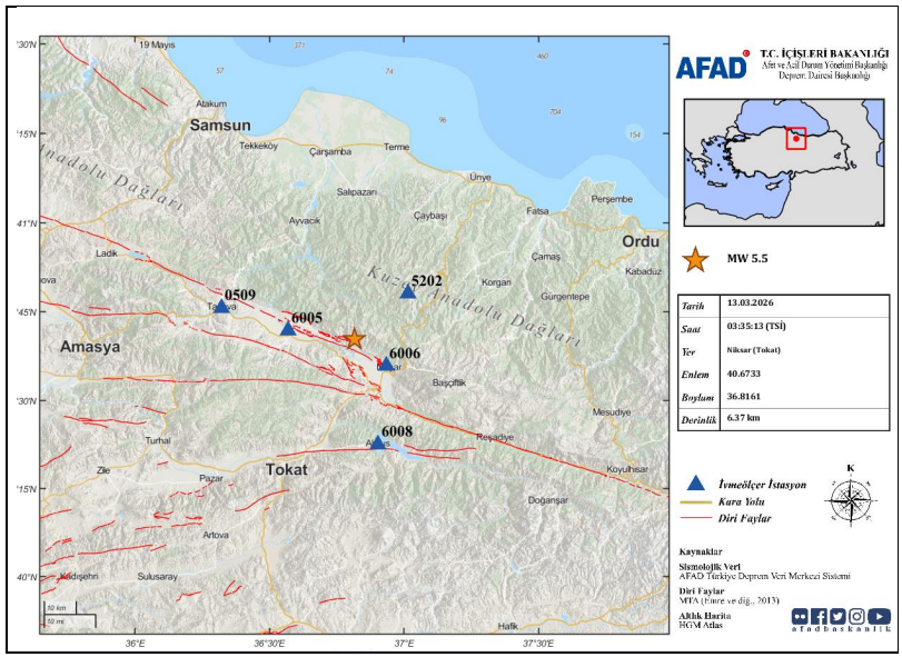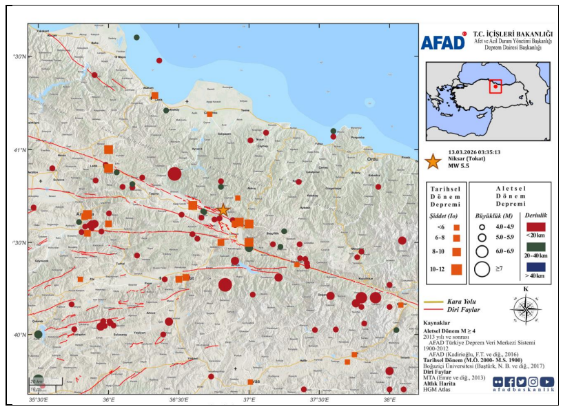 13 Mart 2026 tarihinde Tokat’ın Niksar ilçesi merkez üssünde MW 5.5 büyüklüğünde bir deprem meydana geldi. Deprem ve Risk Azaltma Genel Müdürlüğü Deprem Dairesi Başkanlığı tarafından hazırlanan ön değerlendirme raporuna göre, depremin derinliği 6.37 km olarak ölçüldü. En yakın yerleşim birimi olan Kiraci köyü deprem merkezine yalnızca 1.60 km uzaklıkta bulunuyor.