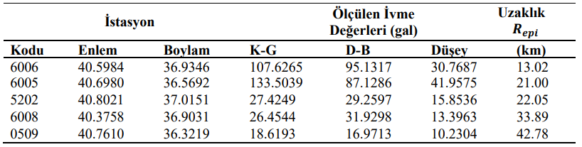 Depremi kaydeden en yakın 5 ivmeölçer istasyonun dağılımı 110 adet ivmeölçer ile yapılan ön değerlendirme sonuçlarına göre, serbest alan (freefield) istasyonları içerisinde, en büyük ivme 6006 kodlu ivmeölçer istasyonunun Kuzey-Güney bileşeninde 107.63 gal olarak ölçülmüştür.