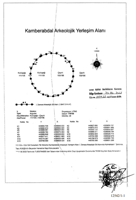 Tapu kayıtlarına ise “Bir bölümü Kamberabdal Arkeolojik Yerleşim Alanı I. derece arkeolojik sit alanında kalmaktadır” şerhi işlendi.