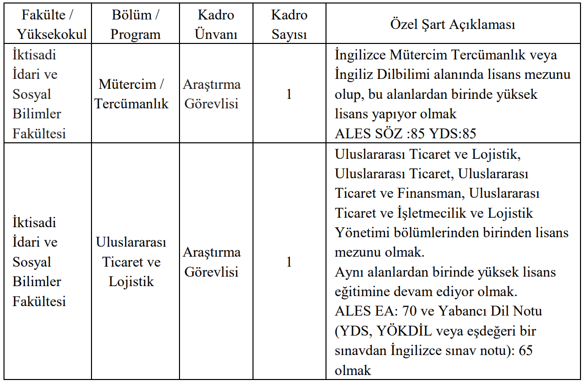 Üniversite, İktisadi, İdari ve Sosyal Bilimler Fakültesi bünyesinde iki farklı bölümde araştırma görevlisi alımı gerçekleştirecek. Buna göre: