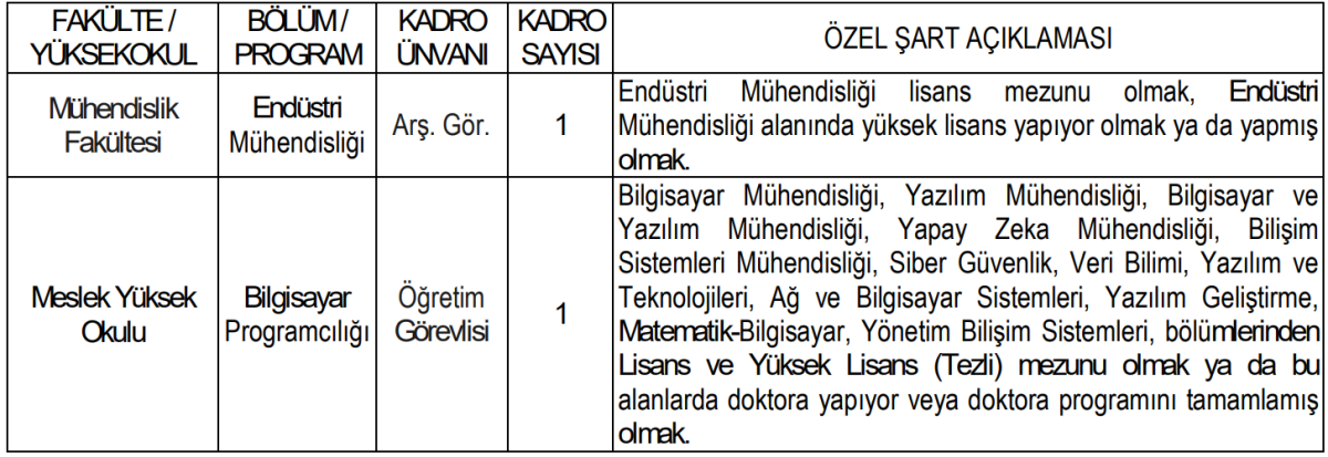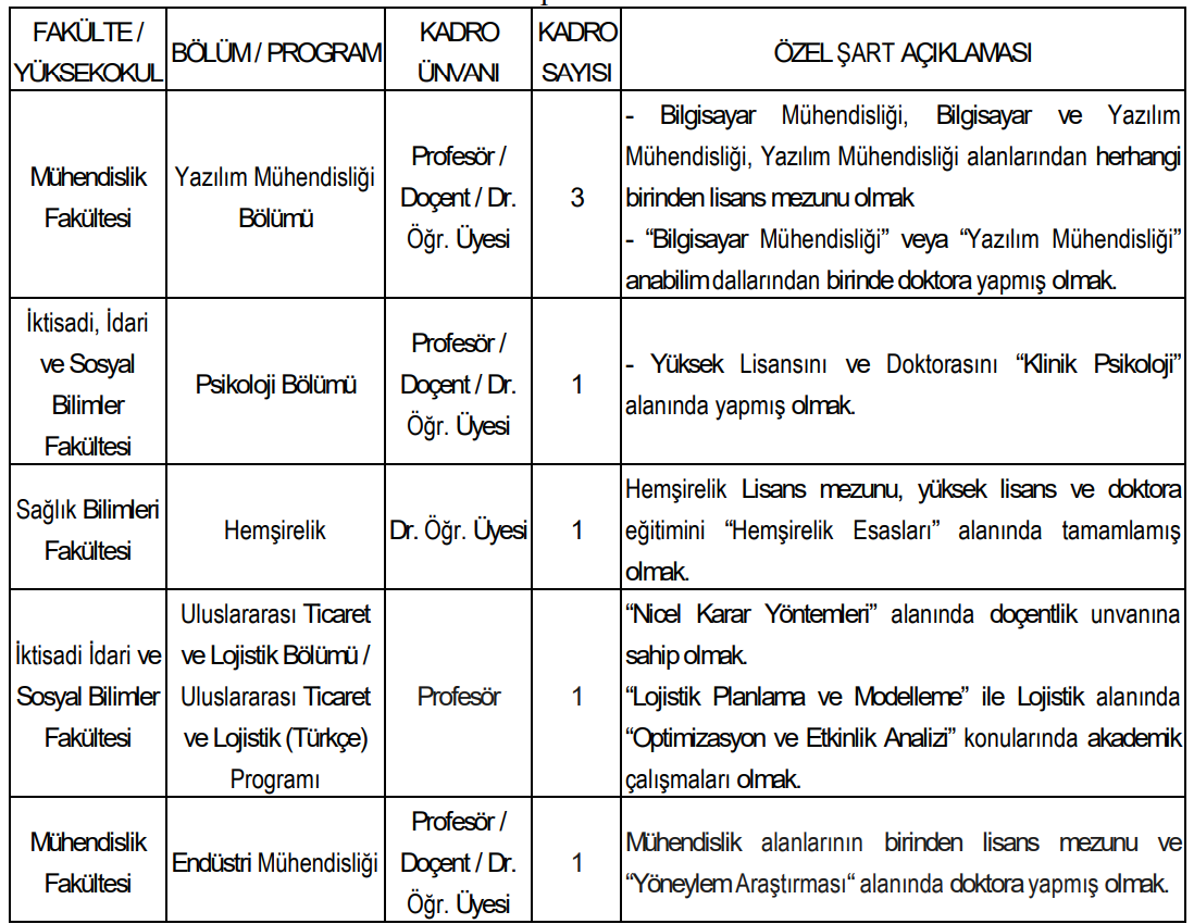 ÖĞRETİM ÜYESİ ALIMI YAPILACAK KADROLAR