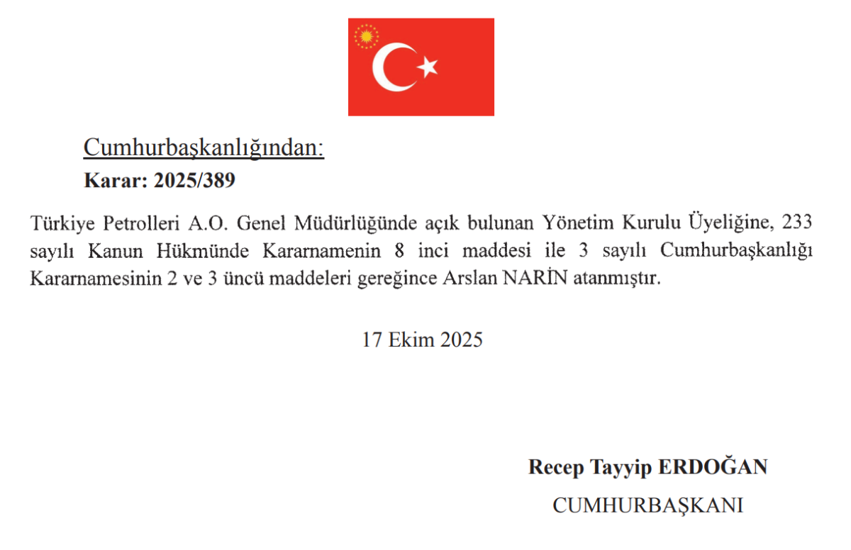 18 Ekim 2025 tarihli ve 33051 sayılı Resmî Gazete’de yayımlanan Cumhurbaşkanlığı Kararı (2025/389) ile Türkiye Petrolleri Anonim Ortaklığı (TPAO) Genel Müdürlüğü bünyesinde önemli bir atama gerçekleştirildi.