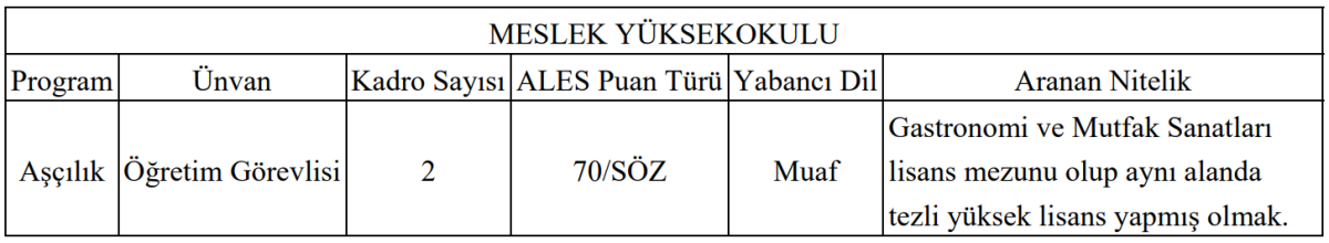 Yayımlanan ilana göre Avrasya Üniversitesi Meslek Yüksekokulu Aşçılık Programı için 2 öğretim görevlisi kadrosu açıldı. Kadroya başvuracak adayların Gastronomi ve Mutfak Sanatları lisans mezunu olması ve aynı alanda tezli yüksek lisans yapmış olması gerekiyor. ALES puan türü olarak sözel (SÖZ) alanı esas alınırken adayların en az 70 ALES puanına sahip olması şartı aranıyor.