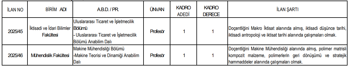 İlan kapsamında üniversitenin birçok fakültesinde profesör ve doçent kadroları açıldı. Özellikle İktisadi ve İdari Bilimler, Mühendislik, Sağlık Bilimleri, Edebiyat, Spor Bilimleri ve İletişim Fakülteleri için ilan edilen kadrolar öne çıkıyor.