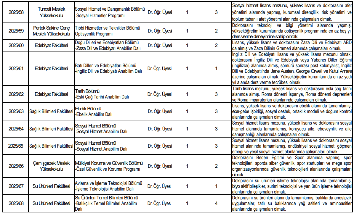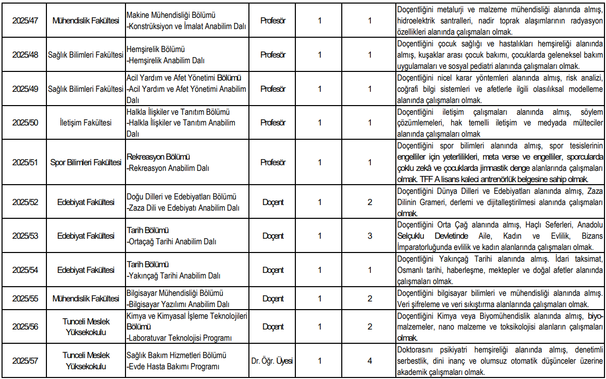 Munzur Üniversitesi, çok sayıda doktor öğretim üyesi alımı da yapacak. Sağlık Bilimleri Fakültesi, Edebiyat Fakültesi, Su Ürünleri Fakültesi ve meslek yüksekokulları bu kapsamda öne çıkan birimler arasında yer alıyor.
