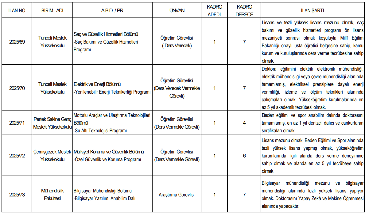 Munzur Üniversitesi tarafından yayımlanan öğretim üyesi alım ilanında, adayların 657 sayılı Devlet Memurları Kanunu’nun 48. maddesinde yer alan genel şartları taşıması zorunlu tutuluyor. Yurt dışından alınan diplomalar için ise Üniversitelerarası Kurul (ÜAK) denklik onayı aranıyor.