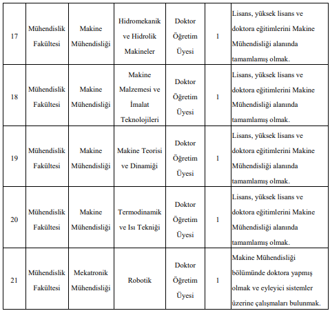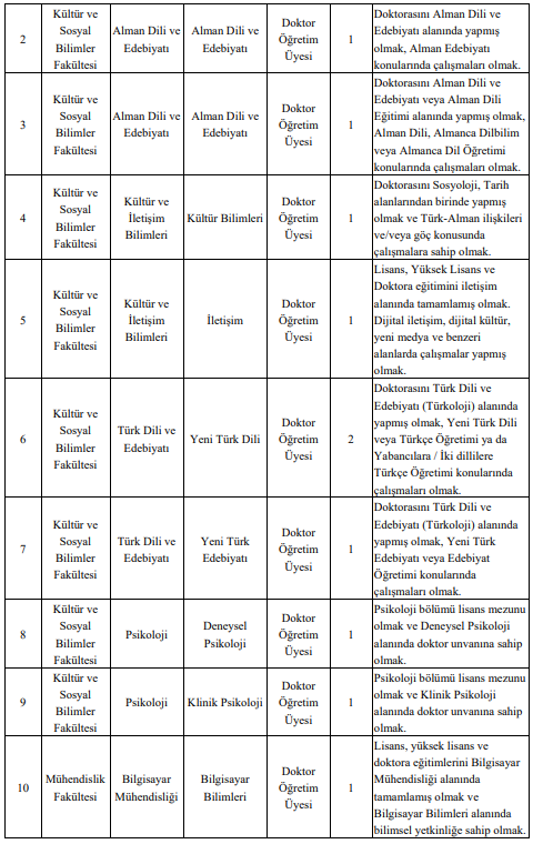 Üniversite, İktisadi ve İdari Bilimler Fakültesi, Kültür ve Sosyal Bilimler Fakültesi ve Mühendislik Fakültesi’ne farklı alanlarda Doktor Öğretim Üyesi alacak. Özellikle Siyaset Bilimi, Alman Dili ve Edebiyatı, Kültür Bilimleri, İletişim, Türk Dili ve Edebiyatı, Psikoloji ve Mühendislik alanlarında uzman öğretim üyeleri aranıyor.