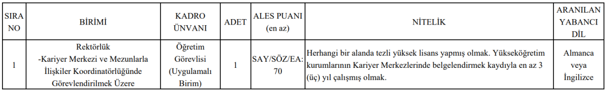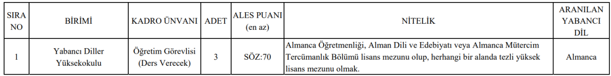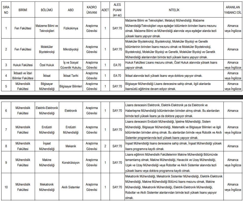 Özellikle Malzeme Bilimi, Moleküler Biyoteknoloji, Bilgisayar Mühendisliği, Elektrik-Elektronik, Endüstri, Makine ve Mekatronik Mühendisliği gibi teknik alanlarda adayların Almanca veya İngilizce dil yeterliliğine sahip olmaları bekleniyor. Öğretim görevlisi kadrolarında ise Almanca alanında lisans ve yüksek lisans eğitimini tamamlamış adaylar öncelikli olacak.