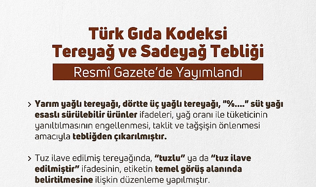 Tereyağı algısını suistimal eden görsellere yasak: Tereyağı ve sadeyağ dışında kalan yağ çeşitlerinin etiketi, reklamı, tanıtımı ve sunumunda, tereyağı veya sadeyağ algısı oluşturacak ifadelerin ve görsellerin kullanımına yasak getirildi.