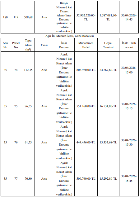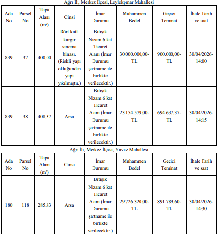 Ağrı Belediye Başkanlığı tarafından yapılan duyuruya göre, şehir merkezinde bulunan birçok değerli taşınmaz satışa çıkarıldı. Leylekpınar, Yavuz ve Gazi mahallelerinde yer alan arsalar için ihale tarihi 30 Nisan 2026 olarak açıklandı.
