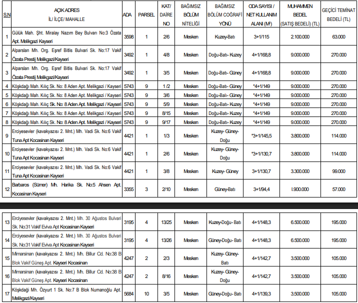 Kayseri Vakıflar Bölge Müdürlüğü tarafından yapılan ilan kapsamında çok sayıda konut satışa çıkarıldı. Farklı büyüklüklerde ve oda sayılarında daireler için 25 Haziran 2026 tarihinde açık teklif usulü ile ihale yapılacak.
