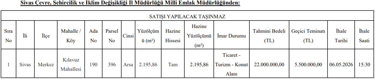 Sivas’ta Milli Emlak Müdürlüğü tarafından satışa çıkarılan taşınmaz, ticaret, turizm ve konut alanı imarına sahip olmasıyla dikkat çekiyor. 22 milyon TL muhammen bedelle satışa sunulan arsa için ihale 6 Mayıs 2026 tarihinde yapılacak.