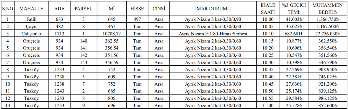 Özellikle ticaret alanı imarlı arsalar dikkat çekiyor. 52 milyon TL’yi aşan muhammen bedellerle satışa sunulan taşınmazlar, yatırımcıların ilgisini çekebilecek nitelikte. İhaleler aynı gün içerisinde farklı saatlerde ayrı ayrı gerçekleştirilecek.