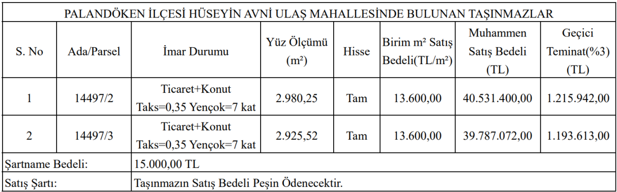 Metrekare satış bedeli 13 bin 600 TL olarak belirlenen taşınmazların muhammen satış bedelleri yaklaşık 40 milyon TL seviyesinde. Geçici teminat bedelleri ise 1,1 milyon TL’nin üzerinde yer alıyor.
