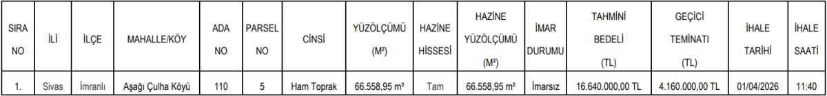 Sivas’ın İmranlı ilçesinde Hazine mülkiyetinde bulunan büyük bir arazi de satışa çıkarıldı. Aşağı Çulha Köyü sınırlarında bulunan taşınmazın yüzölçümü 66 bin 558 metrekare olarak açıklandı.