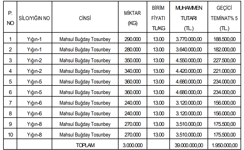 TİGEM, toplam 3 milyon kilogram buğdayı 10 ayrı parti halinde satışa sunuyor. Her bir parti için belirlenen birim fiyatı 13.00 TL/Kg olarak duyuruldu. Bu birim fiyat üzerinden hesaplanan toplam muhammen bedel ise 39.000.000,00 TL (Otuz dokuz milyon Türk Lirası) olarak belirlenmiştir.