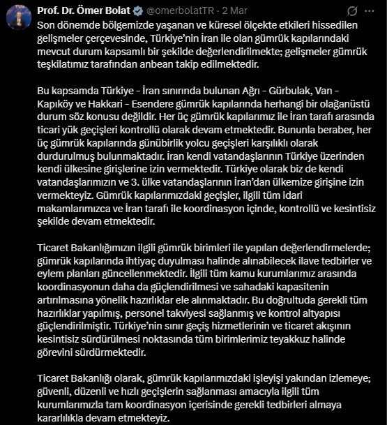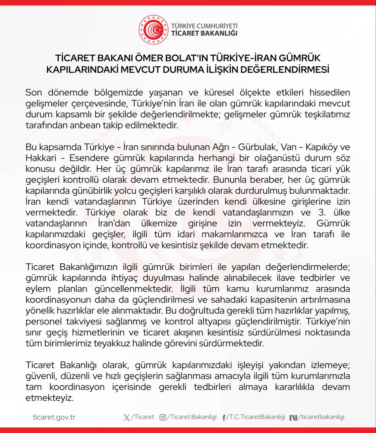 Ticaret Bakanlığı, sınır kapılarındaki işleyişi yakından izlemeye ve gerekli tüm tedbirleri almaya kararlılıkla devam edeceğini açıkladı. Türkiye – İran sınırında geçişler kontrollü şekilde sürerken, gözler bölgedeki gelişmelerde olmaya devam ediyor.